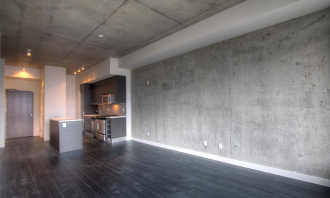Modern, white, minimal Panorama building. Designed by Quadrangle Architects. Developed by Concord Adex. Approximately 693 sf + 37 sf west...